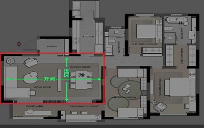 在了解横厅之前,我们先来了解两个名词:开间和进深。住宅的开间是指相邻两个横向定轴线间的距离,进深指建筑物纵深各间的长度。通俗易懂点就是,住宅的采光面即为开间,与之垂直的就是进深。当开间<进深时,客厅比较狭窄,就是竖厅。如下图所示:当开间>进深时,客厅越宽敞,即我们说的横厅,如下图所示。那么知道了二者的区别,横厅究竟好在哪里?